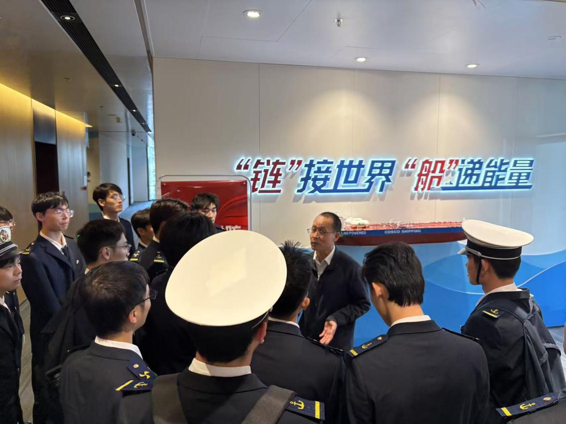 在参观中远海运散货运输有限公司时,同学们了解其作为全球规模最大的专业化散装货物运输企业,拥有各类散货船超500艘,超5100万载重吨,装载铁矿石、煤炭、粮食、散杂货等全品类散装货物,航线覆盖国内沿海和世界主要港口,服务网络遍布全球。在讲解员的介绍下,同学们学习了“桃花山轮”抗击海啸的事迹,认识到优秀海员不仅需要扎实的专业技能,更需要坚定的意志和面对挑战的勇气。