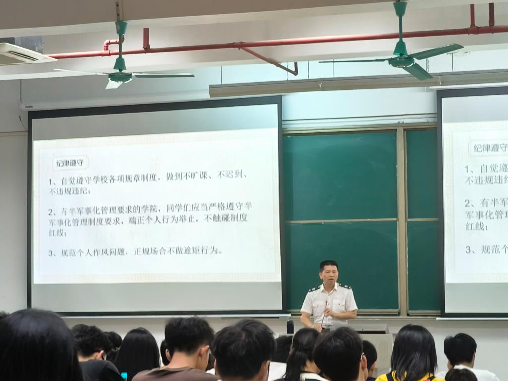 何淋在发言中指出目前学生学习生活中存在的主要问题并提出要求,他要求同学们发挥学院半军事管理制度的优势,自觉遵守学校和学院规章制度,认真学习,打牢专业基础,强调同学们要诚实守信,认真对待每次考试,杜绝作弊行为,并且在学习生活中养成良好的行为习惯,不断提升个人修养,将来做一个对社会和国家有用的人才。
