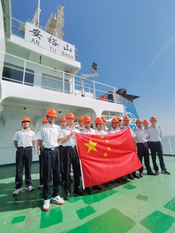 (海运学院供稿)国庆期间,海运学院船舶航行认知实习师生在四艘船上共同庆祝中华人民共和国成立74周年。江剑文、刘春荣两位船长与李顺亮、秦志勇两位老师带领航海技术22级学生我校与中远海运散货运输有限公司合作建设的“安字号”实习船上举行升旗仪式,祝愿祖国繁荣富强