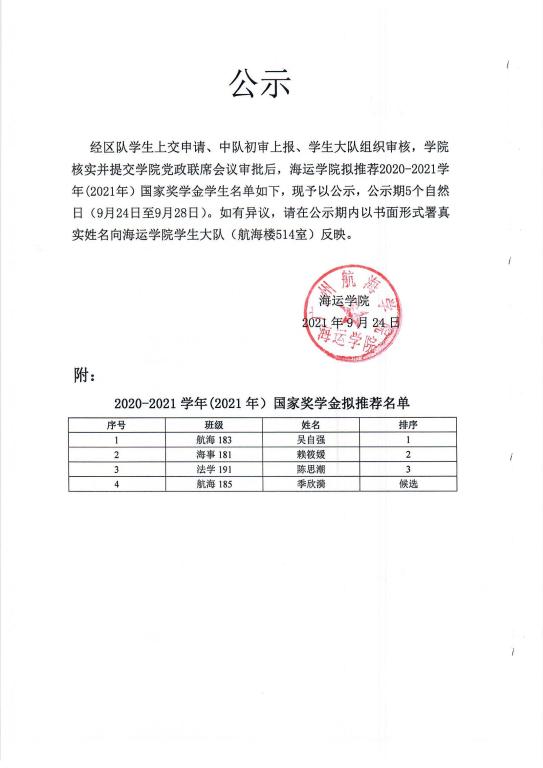 海运学院拟推荐2020-2021学年(2020年)国家奖学金公示