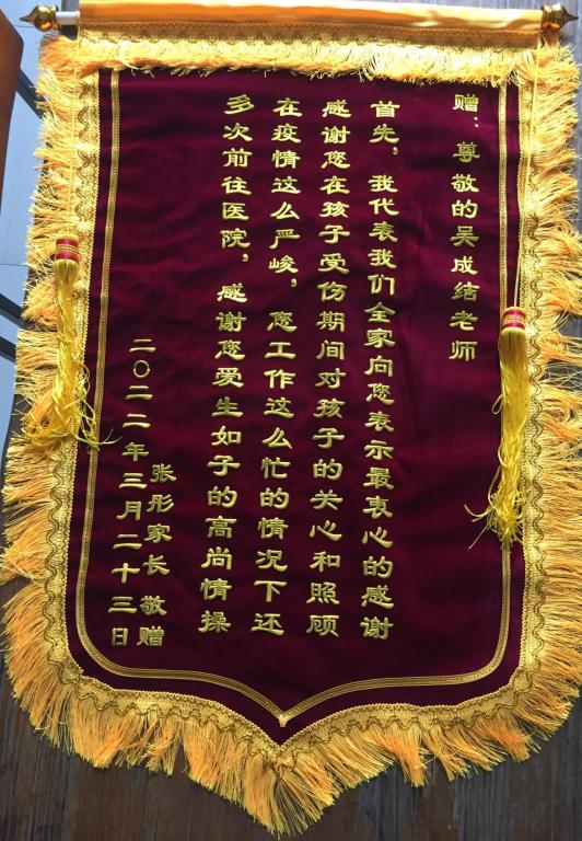 3月18日下午,我院航海213张彤同学在上体育课期间韧带受伤,到广医五院检查后需要马上做韧带手术,中队长吴成结老师马上前往医院协调其住院事宜,跟该生家长沟通检查、手术等情况,并多次前往医院照顾学生,帮助该生手术后康复治疗、沟通医保报销等。该生家长表示因为家远在黑龙江疫情管控区,无法到医院照顾,在特别无助的时候是吴老师给了张彤及我们家长帮助和安慰,无法用言语表达对吴老师的谢意,衷心感谢吴老师和同学们对他的帮助和照顾。锦旗每一行文字都饱含着家长的真挚情感和蕴藏着老师爱的情怀,更是家长对吴成结老师的褒奖。真爱如雨,润物无声,多年来,吴成结老师认真做好学生工作,以学生为中心,细心关爱每个学生的身心健康,深受学生好评。