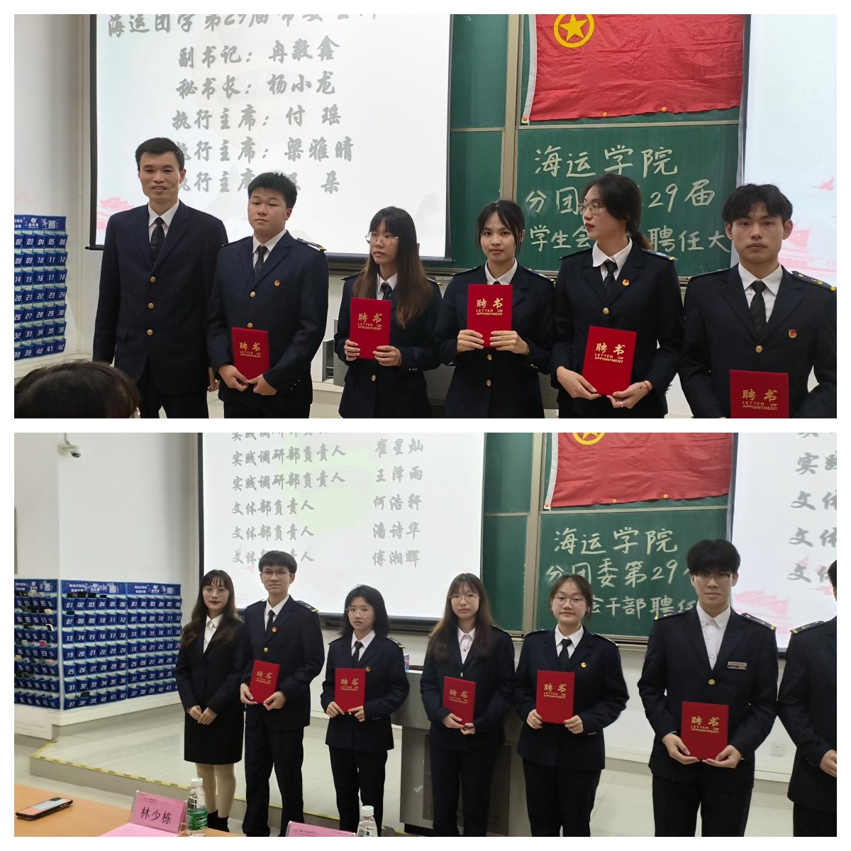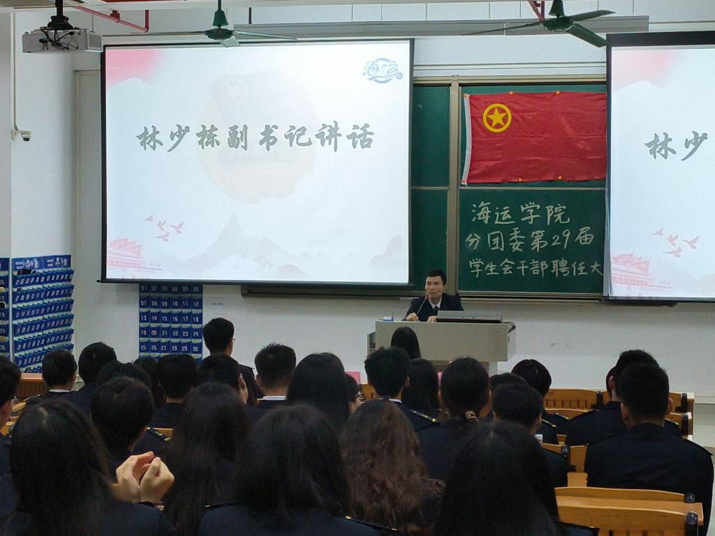 会议在共青团团歌《光荣啊!中国共青团》中拉开帷幕。分团委副书记冉敬鑫同学、学生会执行主席付瑶同学分别就学院分团委和学生会上年度工作情况和本年度工作计划进行汇报。随后,林恬恬老师宣布《关于聘任冉敬鑫等30名学生为海运学院第29届分团委学生会主要干部的决定》和《关于录用周晓飞等89位学生为海运学院分团委学生会干事的决定》。林少栋老师、林恬恬老师分别为团学干部颁发聘书。