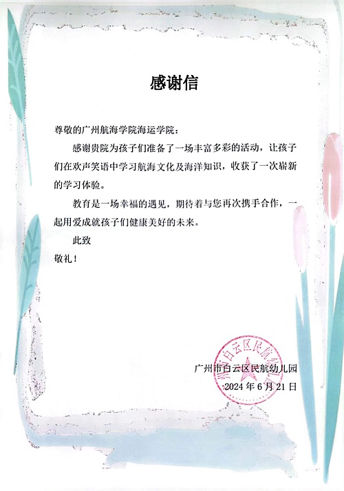 本次活动持续近一小时,让孩子们在欢声笑语中学习航海文化及海洋知识,收获了一次崭新的学习体验。同时,本次科普活动得到了民航幼儿园领导和老师们的一致认可,特向海运学院发来感谢信。