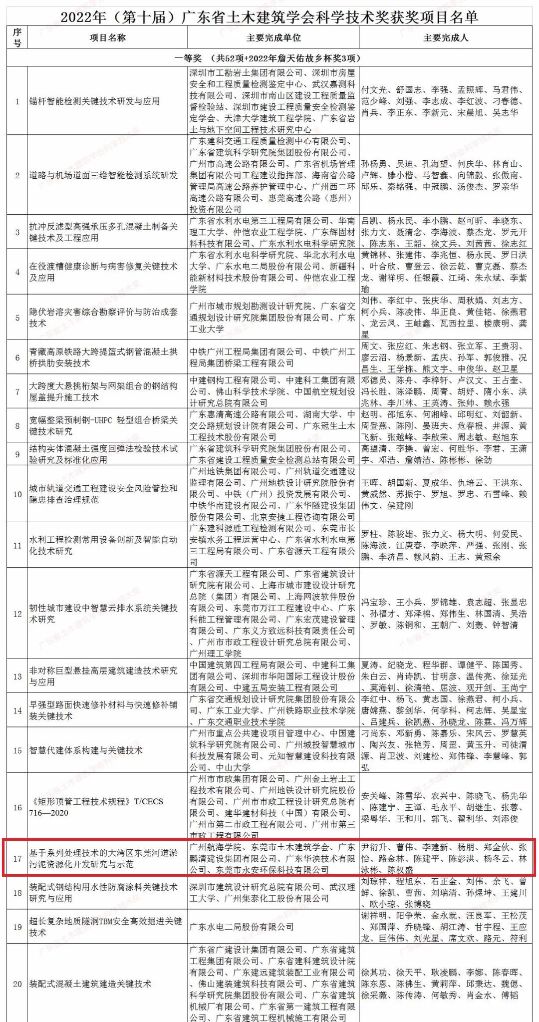 (轮机工程学院 供稿)由我校牵头,东莞市土木建筑学会、广东鹏清建设集团有限公司、东莞市永安环保科技有限公司、广东华泱技术有限公司共同完成的《基于系列处理技术的大湾区东莞河道淤污泥资源化开发研究与示范》项目获广东省2022年度土木建筑学会一等奖。轮机工程学院尹衍升教授、路金林教授、张怡博士后和土木与工程管理学院李建新教授、杨朋副教授为该奖励的获得做出了显著的学术贡献。