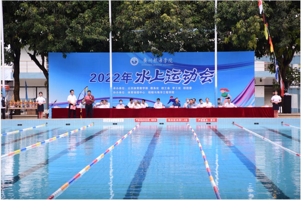 2022年水上运动会在游泳池如期召开。唐强荣副校长主持开幕式,校党委书记、校长邹采荣致开幕词并宣布本届水上运动会开幕。轮机工程学院2019级何宇鹏同学代表运动员宣誓,公体部胡婧老师代表裁判员宣誓。