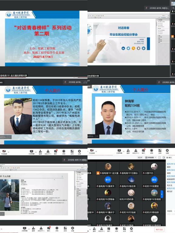 本次活动,一位校友在山东,一位校友在阿联酋,轮机师生在广州,虽然相处三地,线上交流,但没有影响活动的热情,活动全程超过了2个小时。通过此次活动,充分发挥了青春榜样对同学们的模范引领作用,让大家切身感受到了青春榜样的力量,也为同学们成长道路上遇到的问题提供了更多的经验和帮助,相信同学们再做职业规划时将更有信心有动力。希望我们轮机学子在哪里都能踔厉奋发,笃行不怠,以实际行动迎接党的二十大胜利召开。
