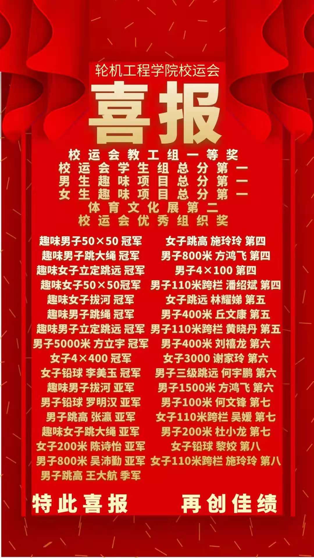 在运动场上,轮机人赛出精神,赛出风格。其中学生组分别斩获男子50x50迎面接力、男子跳大绳、男子一分钟跳绳、男子立定跳远第一名,男子拔河第二名,男子5000米第一名,男子1500米第六名,男子800米第二名、第四名,男子400米第五名、第六名,男子200米第七名,男子100米第七名,男子铅球第二名,男子跳高第二名、第三名,男子三级跳远第六名,男子4x400接力第二名,男子4x100米接力第四名,男子110米跨栏第四名、第五名;女子立定跳远、女子拔河第一名,女子50x50迎面接力、女子跳大绳第二名,女子3000米第六名,女子200米第二名,女子铅球第一名、第八名,女子跳高第四名,女子跳远第五名,女子4x400米接力第一名,女子110米跨栏第七名、第八名,教工组斩获超级毛毛虫第一名、飞龙特工第二名、鸿运彩球第三名等多项奖项,展现了轮机运动健儿们敢于竞争、善于竞争的精神风貌。