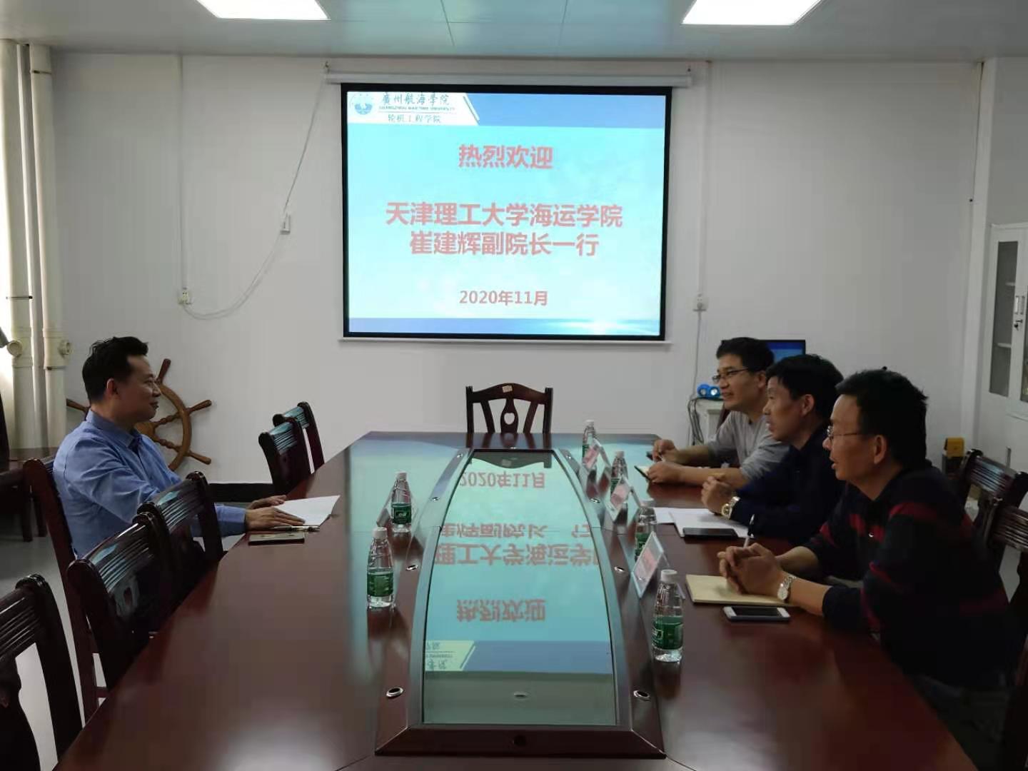 、学科专业、科研项目申报等方面进行了简单介绍,并希望两院之间今后进一步加强交流。沈伟林副院长介绍了学院专业人才培养、教学管理等方面的工作。崔建辉副院长介绍了天津理工大学海运学院的基本情况以及此次调研的主要目的。他认为轮机工程学院的专业建设特色鲜明,实验室建设稳步推进,专业、学科课程设置等方面有很多工作经验和方法值得学习借鉴,希望以后双方加强沟通交流,能在专业建设和实验室建设等方面开展合作。会后,双方就相关问题展开了热烈讨论,达成了初步合作意向。