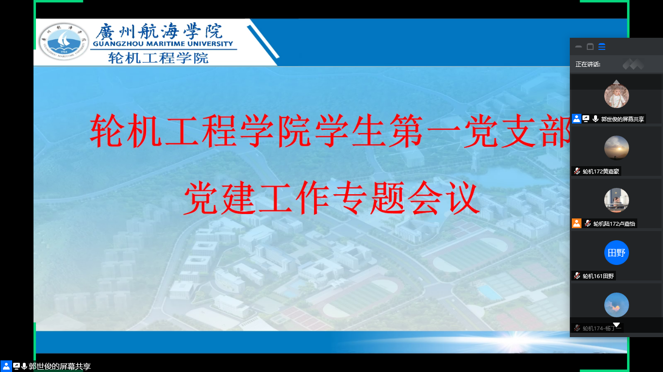 (轮机工程学院供稿)为提升学院党建工作水平,5月18和21日,轮机工程学院学生党支部线上召开党建工作专题会议。学院学生第一、第二党支部书记郭世俊、钟聪仕老师主持会议,学生党支部全体党员参加了会议。