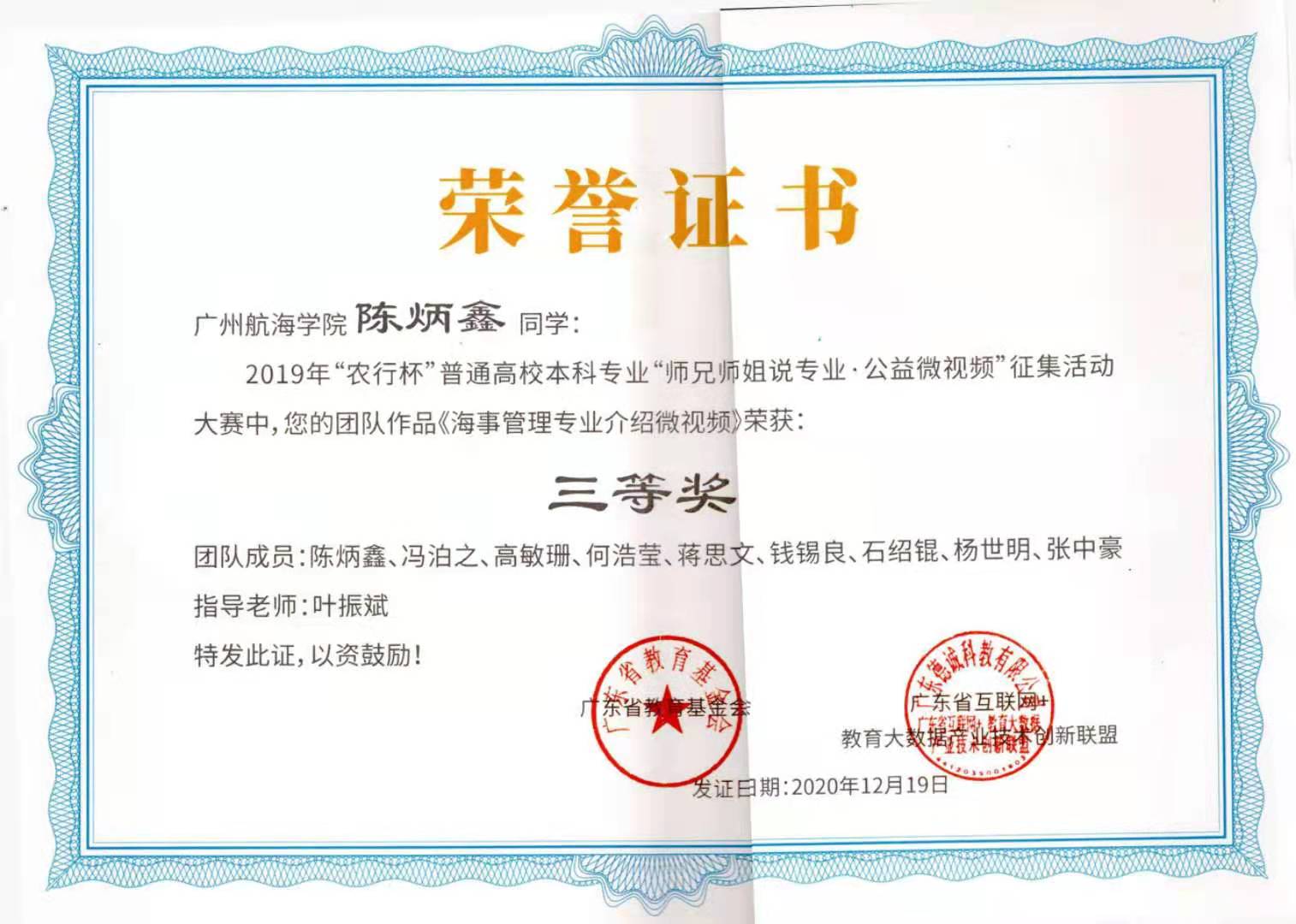 陈炳鑫团队-获2019年“农行杯”普通高校本科专业“师兄师姐说专业.公益微视频”作品《航海技术专业介绍微视频》三等奖