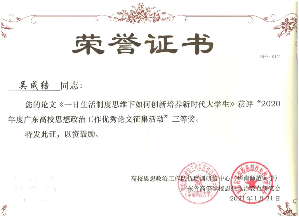 吴成结老师论文《一日生活制度思维下如何创新培养新时代大学生》获评“2020年度广东高校思想政治工作优秀论文征集活动”三等奖